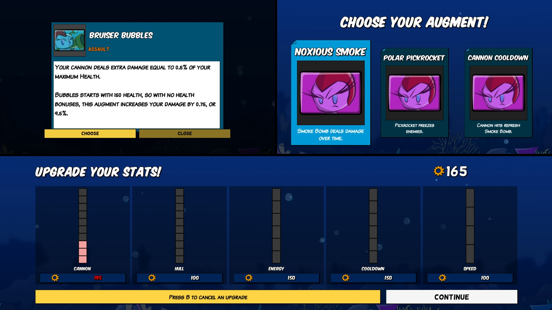 Your favorite fish have gotten upgrades to fight the dolphin menace. In general, each character is much more specialized than in the past, providing your team with unique strengths. The new Fingeance demo features these new character ships, as featured in our articles on Bubbles, Gil, Dorsa , and, of course, Finn. Equally important, the game is more approachable than ever before. Brand new rebalanced difficulties await, promising fun for salty dogs and landlubbers alike. Starting character loadouts are also much easier to use, leading to a far more fun learning curve.